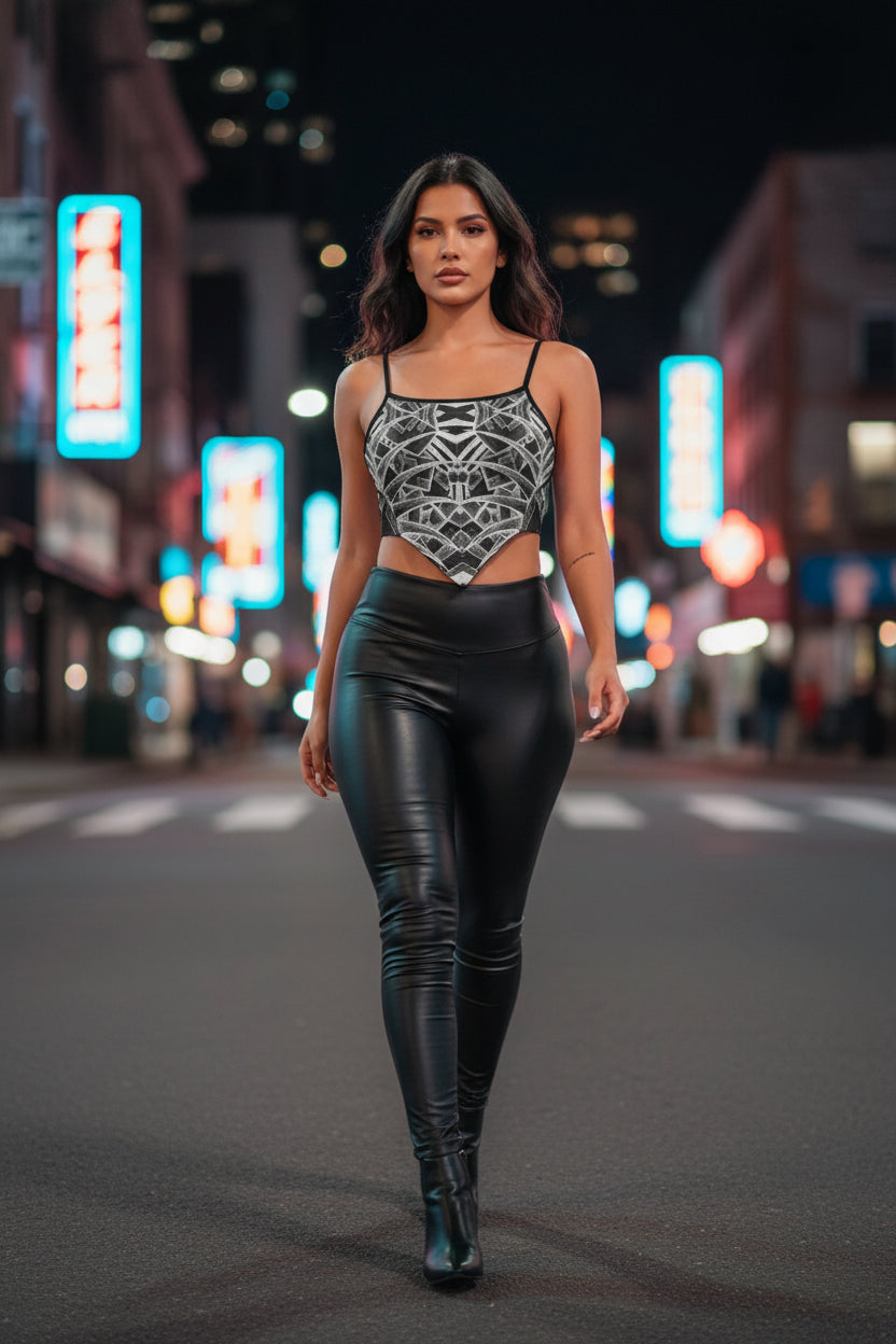 Sexy wrap-up top with black edging and spaghetti straps, which can match well with jeans