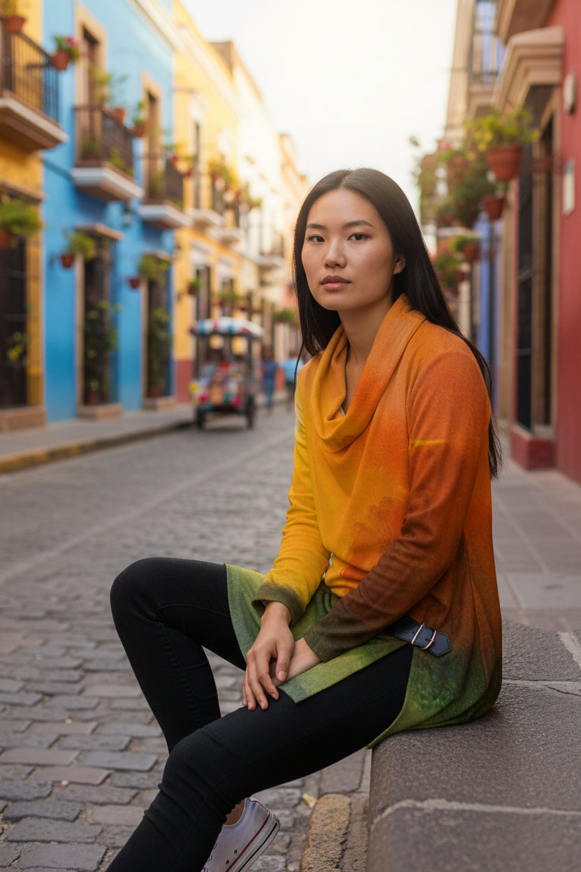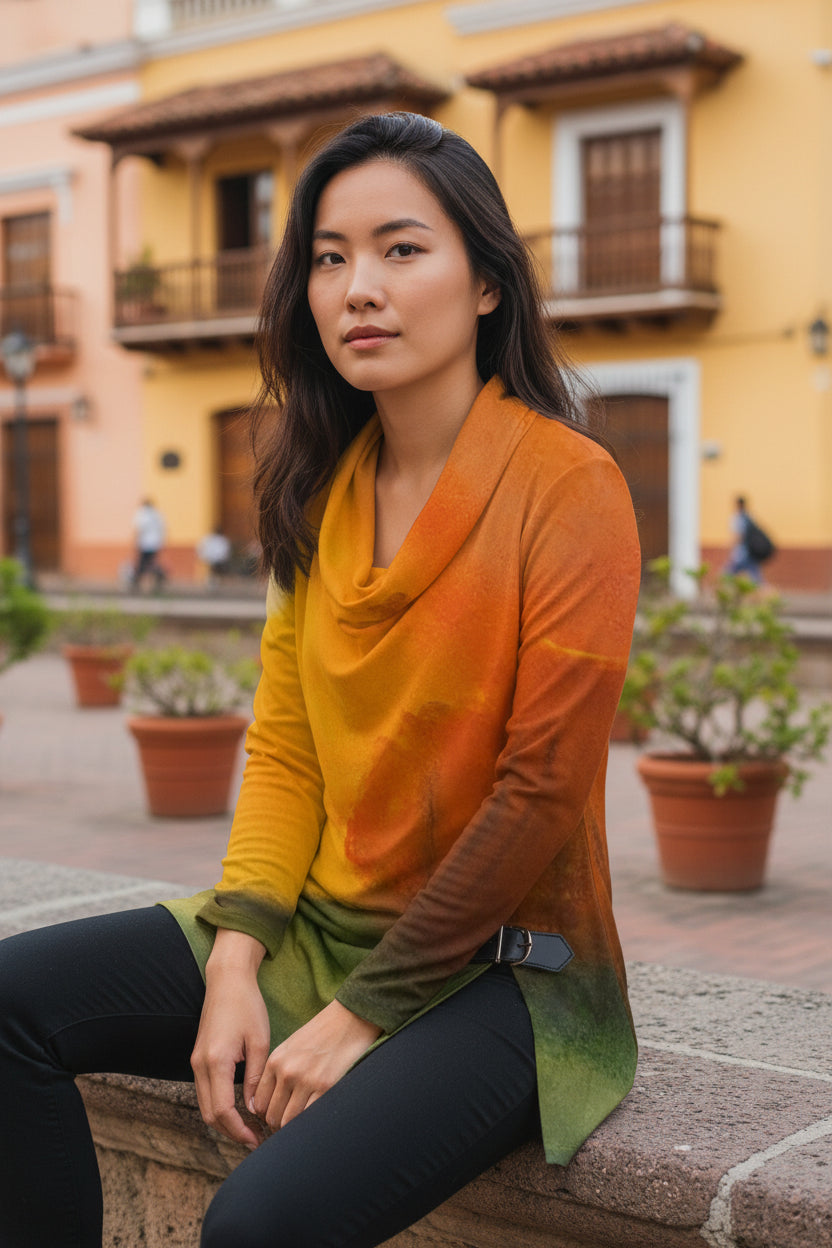 Elevate your casual looks with this stunning draped top in super-soft polyester that feels like cotton and is breathable. The relaxed draped neckline, fitted cuffs and asymmetric hem with stylish buckle detailing bring comfort and personality to your everyday looks. Whether you pair it with jeans, leggings or accessories, it's the perfect finishing touch to your style.