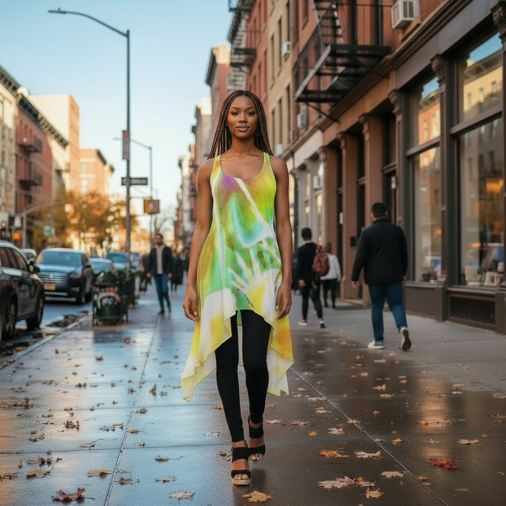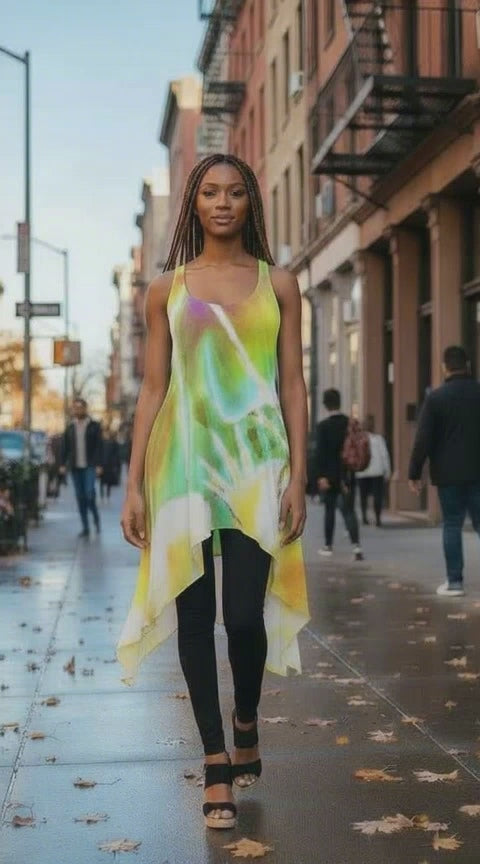This sleeveless tank dress combines laid-back comfort with subtle elegance. Designed in a flowy high-low hem silhouette, it features a classic scoop neckline and a minimalist leaf print near the hem. The lightweight, cotton-feel polyester fabric offers a soft touch and breathable wear, making it perfect for beach days, vacations, or relaxed weekend looks.
