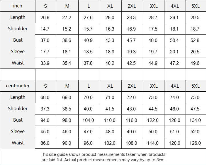 | Centimeter | S | M | L | XL | 2XL | 3XL | 4XL | 5XL |