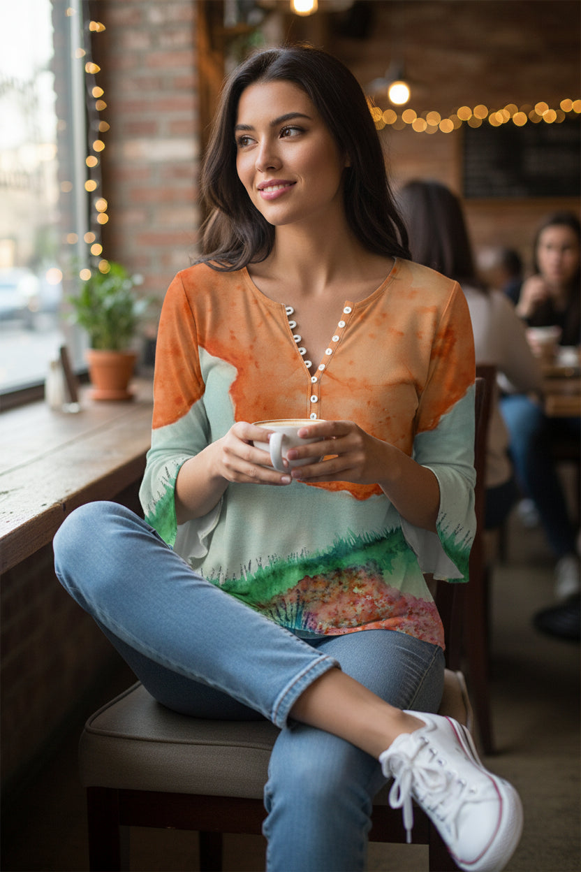 Add a touch of effortless glamour to your wardrobe with this women's shirt. Made from premium cotton-like polyester, it combines the breathable softness of cotton with the durability and wrinkle resistance of polyester. The three-quarter sleeves and flowing hem create a flattering silhouette that flatters all body types. The elegant V-neck design with button details adds a feminine touch, while the abstract art print adds a modern statement. Perfect with jeans, trousers or skirts, it's a versatile piece that can go from day to night.