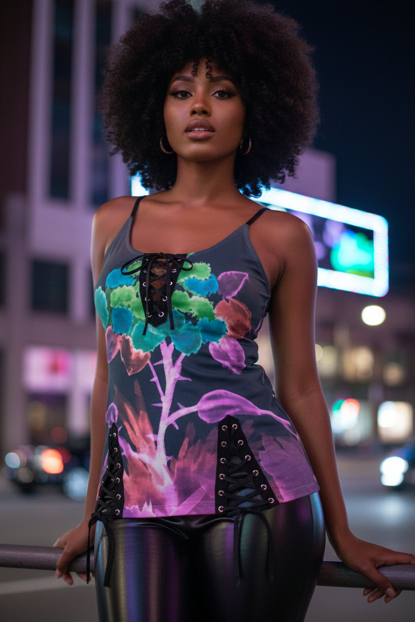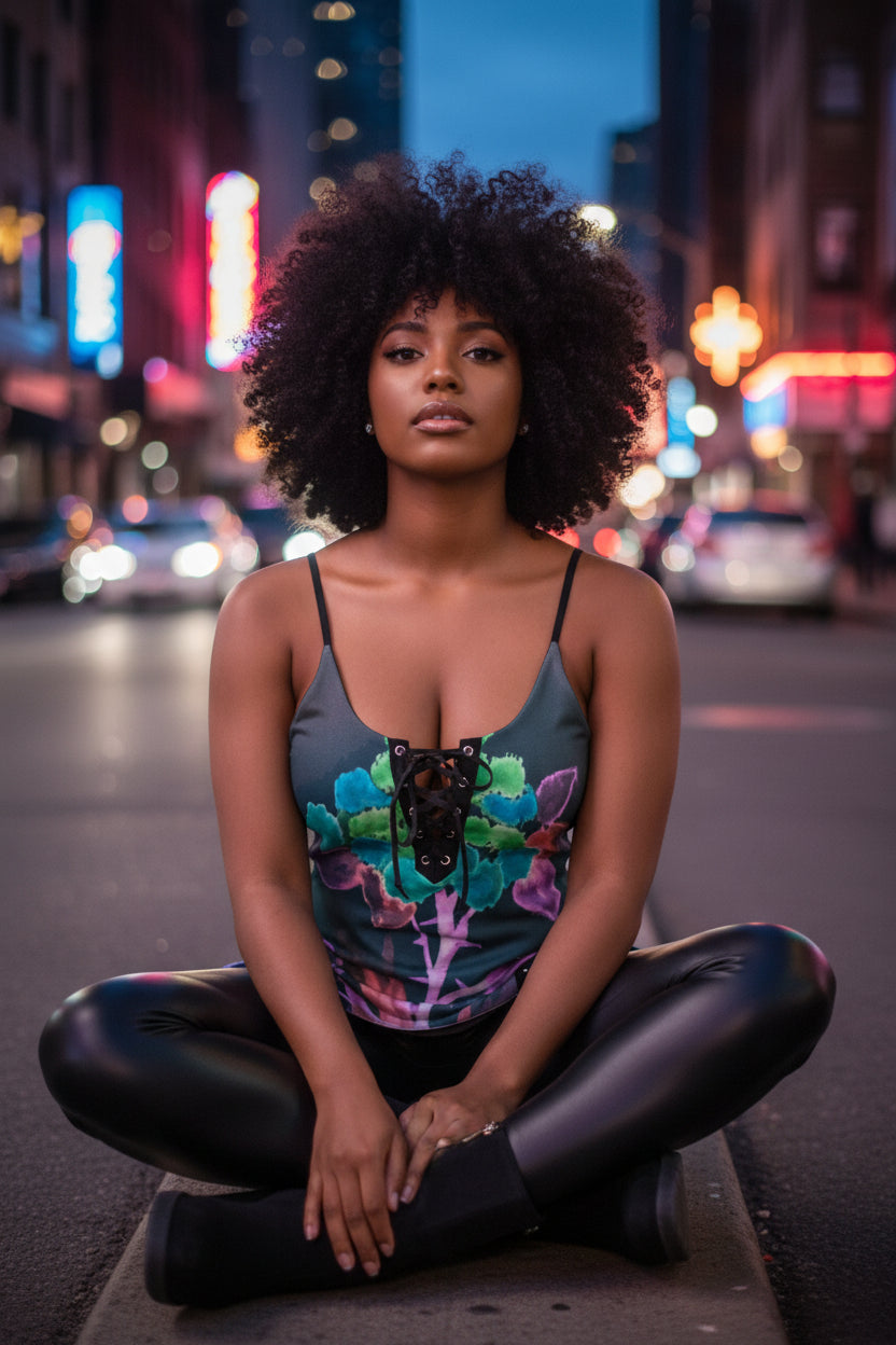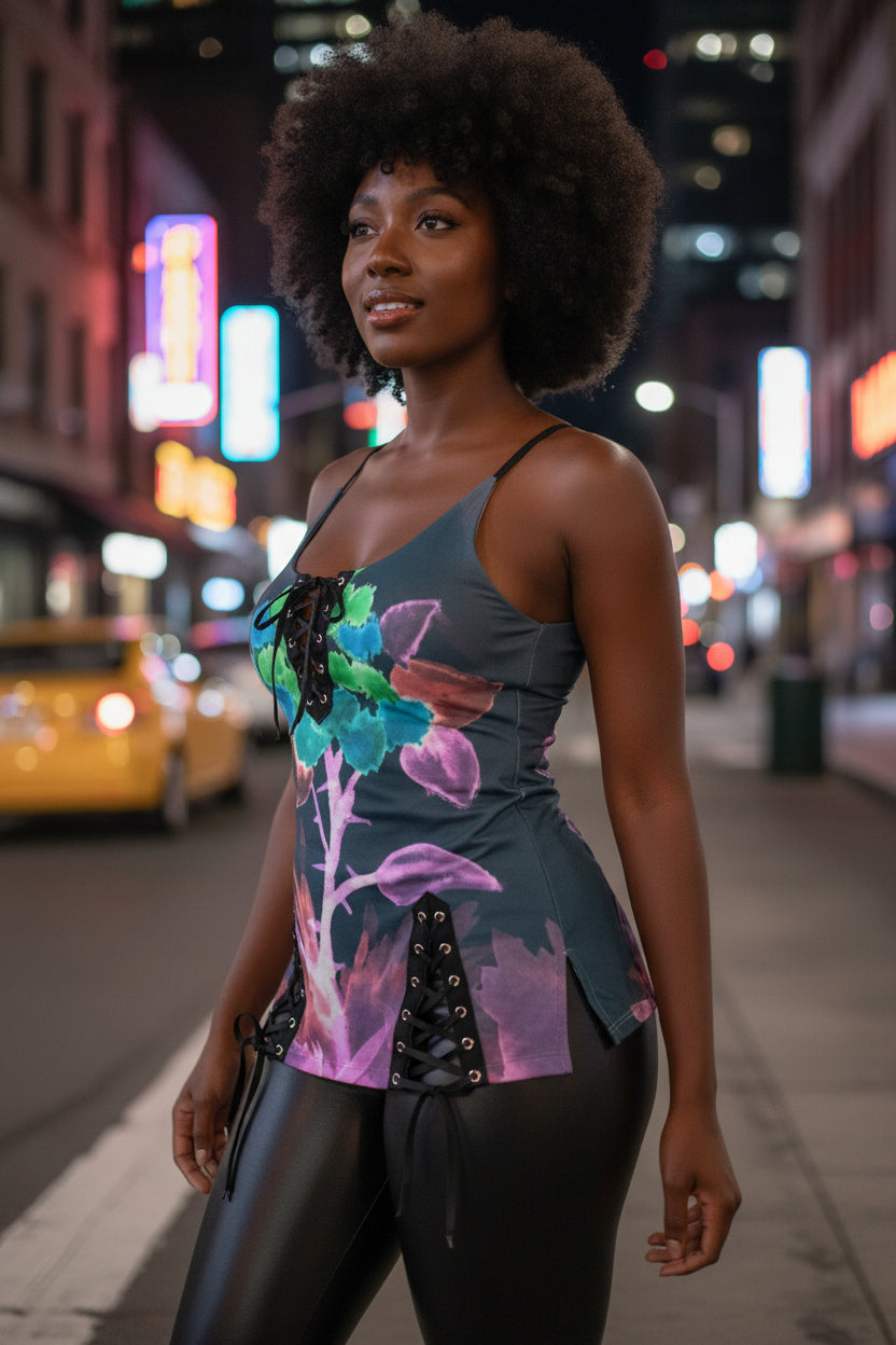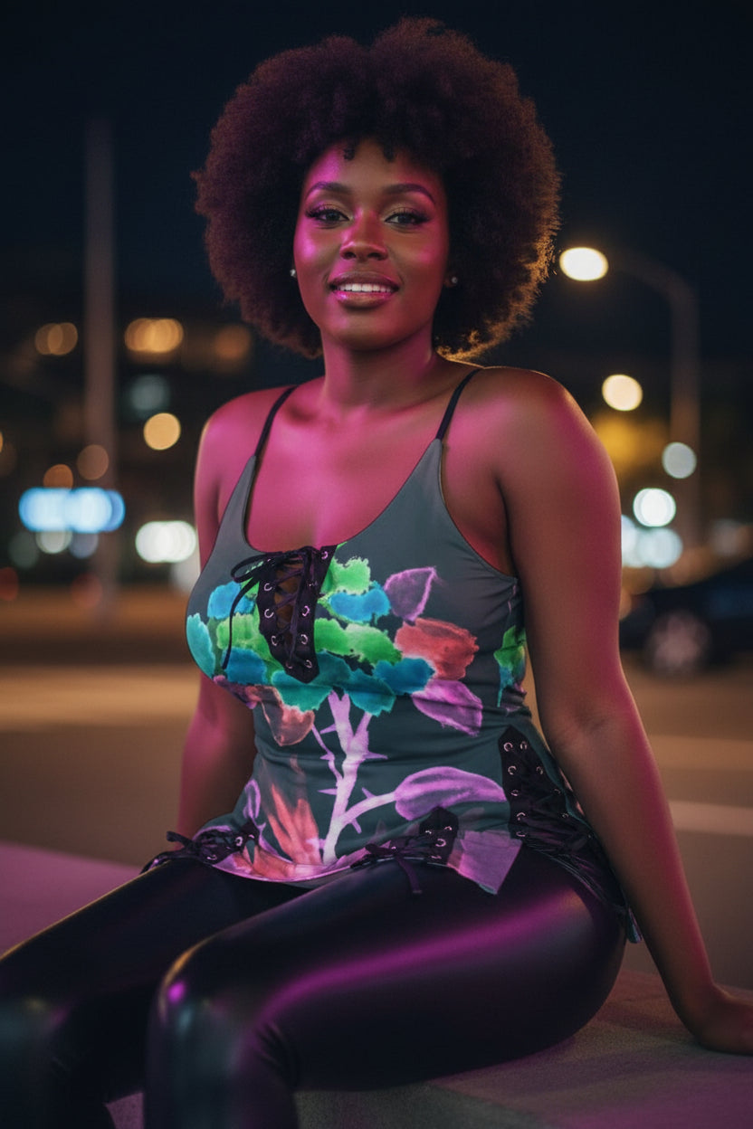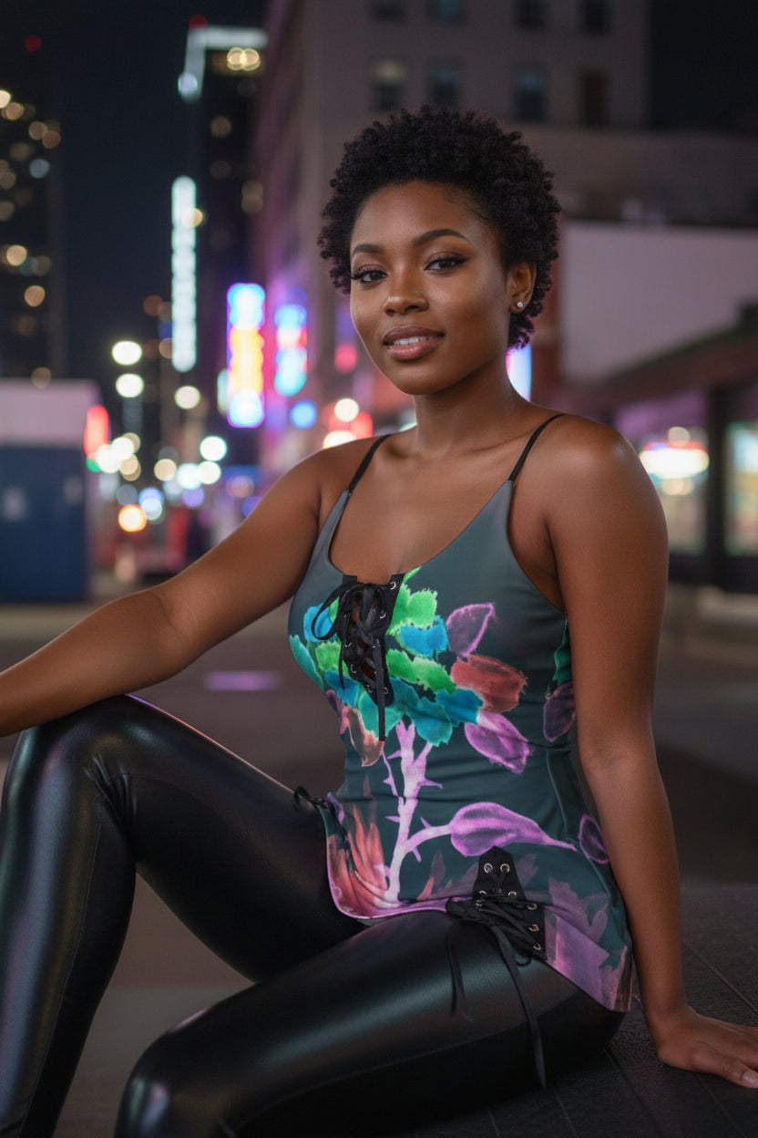 Morning Bloom All-Over Print Women's V-neck Eyelet Lace-up Cami Dress