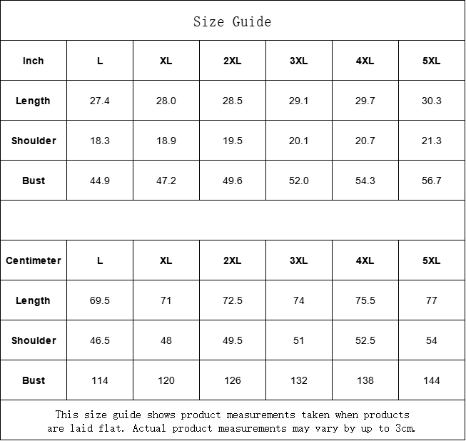 | Centimeter | L | XL | 2XL | 3XL | 4XL | 5XL |