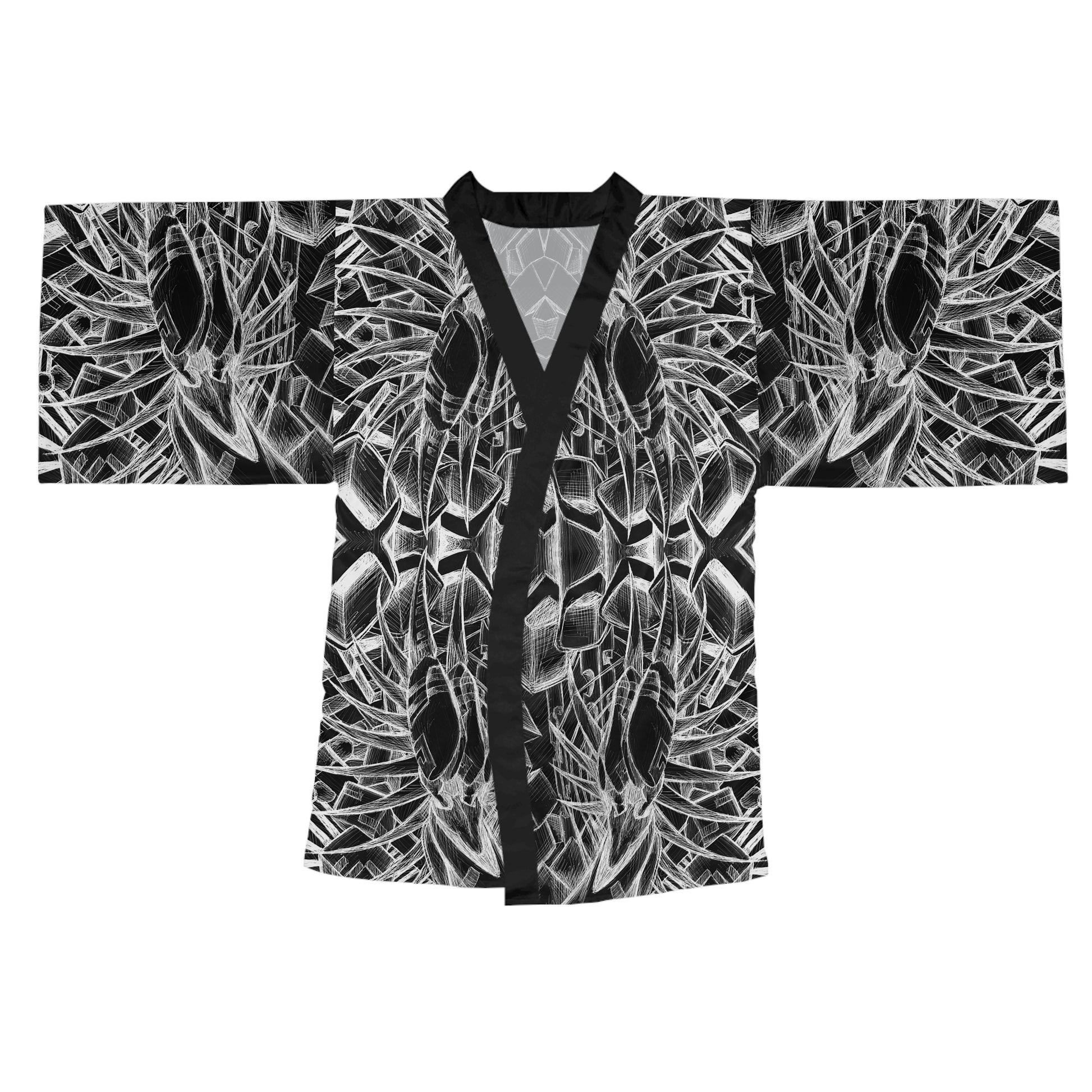 This mid-length kimono robe wraps you in a quiet, sculptural elegance. Lightweight polyester drapes into long bell sleeves and a soft V-front, letting the monochrome, organic pattern flow like inked lace across the fabric. Wear it loose at home to move through slow mornings, or tie the belt and step into evening — the kimono cut flatters the waist while the fluid sleeves add drama without weight. The texture feels smooth against skin and the quick-drying fabric makes it easy to care for between wears. Subtle, architectural print and contrasting trim lend a refined, slightly edgy look that pairs with lounge moments, gallery openings, or layered urban outfits.