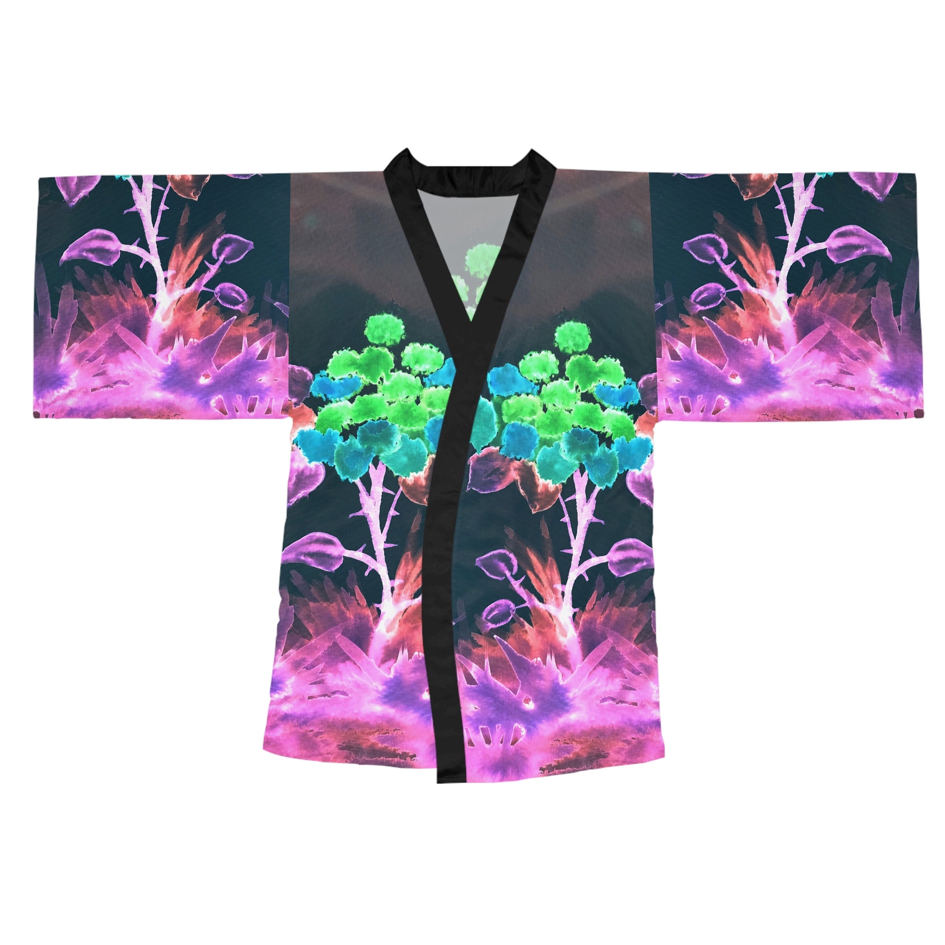 Float into a dream in this mid-length kimono robe, where watercolor blooms and neon foliage drape across a lightweight, smooth fabric. The soft polyester skims the body with an effortless, figure-flattering silhouette and long bell sleeves that move like a slow dance. Wear it as a relaxed at-home kimono to sip tea and sink into quiet evenings, or swap slippers for heels and let the vibrant floral panels turn heads at an evening gathering. The contrasting black trim and belt add structure while keeping the design wearable and modern. Gentle care keeps the colors vivid—use neutral detergent and handle with care when washing. Note: front trim and belt come in black or white and cannot be customized.