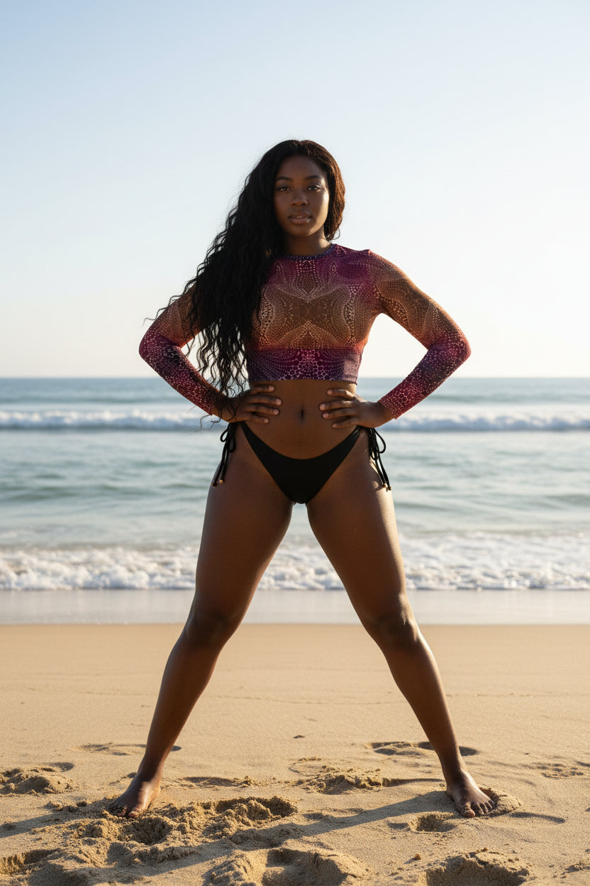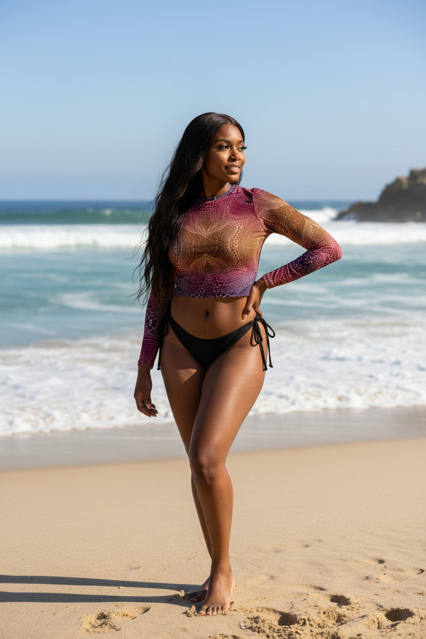 This long-sleeve crop top is made of recycled polyester and elastane, making it an eco-friendly choice for swimming, sports, or athleisure outfits. The crop top has a tear-away care label and a wide, double-layered waistline band for a comfortable fit.